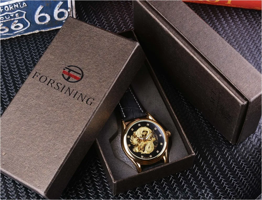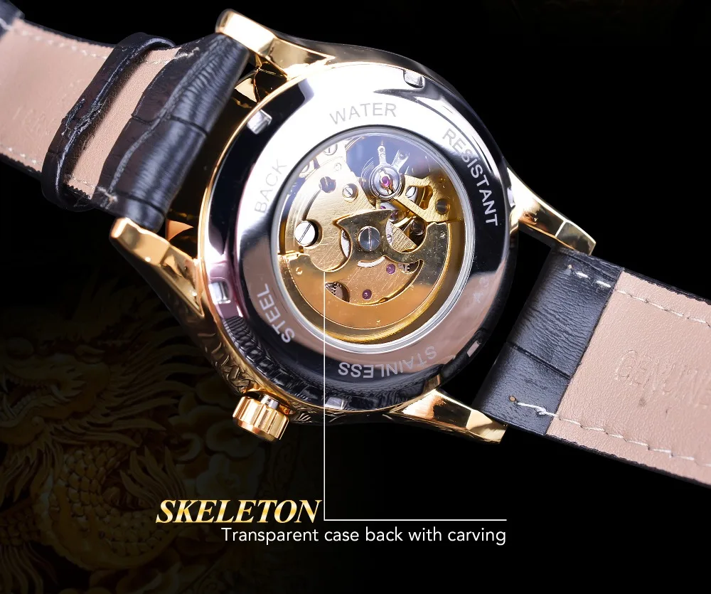 Discover the elegance and functionality of our latest Forsining Dragon Watch, a stunning men's automatic mechanical watch designed for the modern man. This watch combines fashion with practicality, featuring a unique hollow design that allows you to see the intricate workings of the movement inside. The round dial showcases luminous hands, ensuring that you can tell time even in low light conditions. Crafted from durable mineral tempered glass, the mirror provides a clear view while resisting scratches. The case is made from high-quality alloy, offering both style and durability, while the comfortable leather strap adds a touch of sophistication to your look. Whether you prefer the classic silver, sleek black, luxurious gold, striking black gold, or warm brown, we have a color variation to match your personal style. This watch is not only a practical timepiece but also a statement accessory that enhances any outfit. Plus, it's water-resistant, making it suitable for everyday wear. Elevate your wrist game with the Forsining Dragon Watch. Check out the elegant design below:
